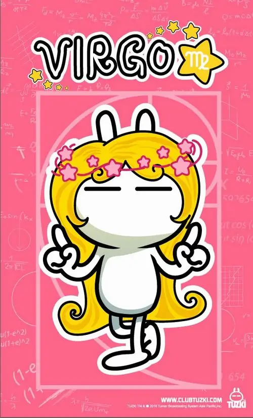 Poster hồng có linh vật đội mũ vàng dang tay cười tươi, nét vẽ hoạt hình ngắn gọn và chữ Virgo đặt phía trên khiến khung ảnh vui mắt theo kiểu ảnh hoạt hình Xử Nữ nhỏ nhắn