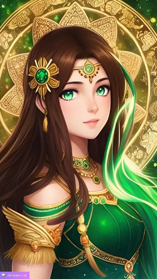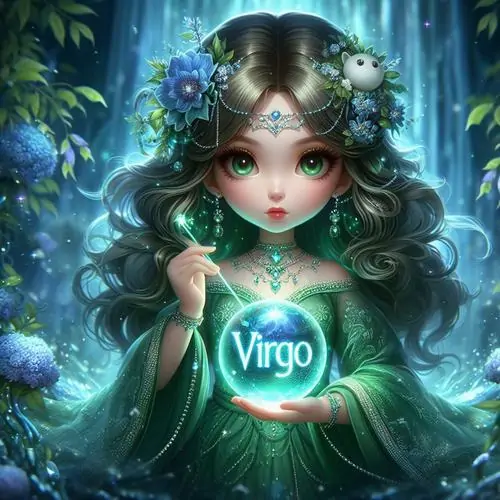 Góc cận mặt cô gái tóc nâu dài đeo trang sức xanh, mắt lớn nhìn thẳng và vai áo ánh kim nổi bật trên nền vàng tròn, tạo cảm giác tranh Virgo nữ chibi khá sang và sáng