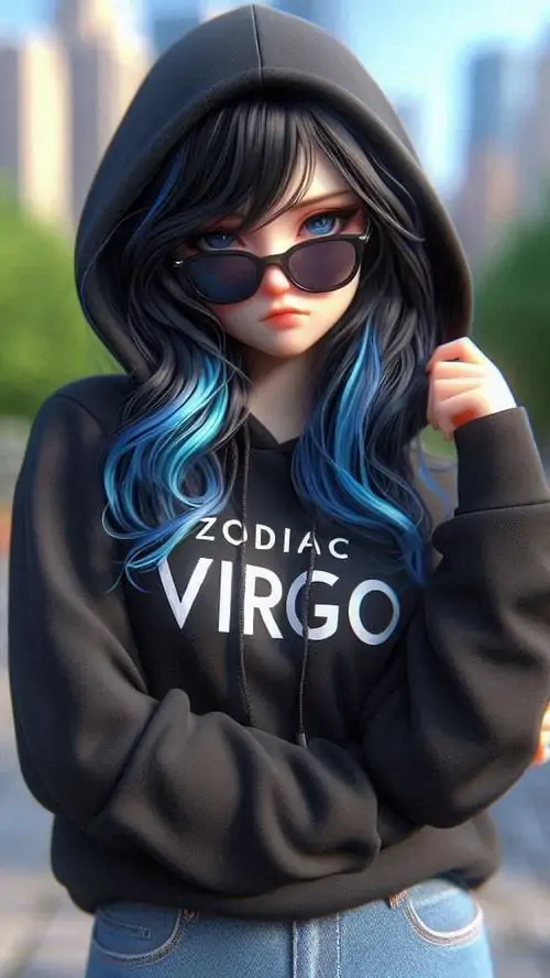 Cô nàng mặc áo hoodie đen, đeo kính râm và cúi đầu nhẹ giữa khung phố mờ, mái tóc xanh tím đổ ra trước ngực khiến hình đại diện Xử Nữ phong cách Nhật có nét ngầu hiện đại