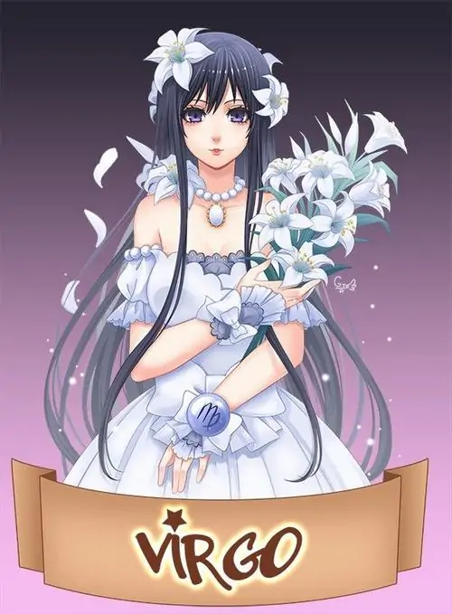 Thiếu nữ tóc xanh đen ngồi nghiêng ôm bó hoa trắng, váy xanh tím ôm gọn thân người và dải chữ Virgo phía dưới làm ảnh nhân vật anime cung thứ sáu trở nên dịu và thanh