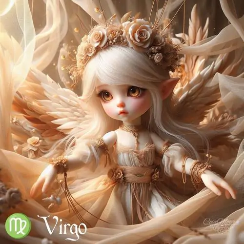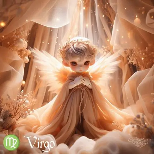 Bé thiên thần đội vòng tròn cung hoàng đạo ngồi giữa nền kem, đôi cánh trắng nhỏ dang ra và váy hồng nhạt khiến nhân vật Xử Nữ tí hon này nhìn rất dễ thương, rất xinh