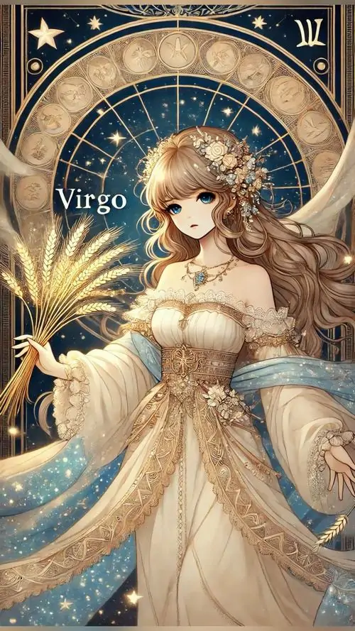 Cô gái anime mặc váy kem ôm eo đứng giữa vòng sao xanh vàng, mái tóc nâu bay mềm và nụ cười dịu khiến tranh vẽ Virgo nữ dễ thương nhìn sang mà vẫn êm mắt
