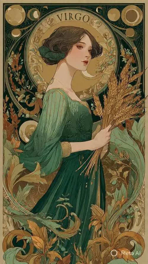 Hình nền thiếu nữ tóc nâu búi thấp nghiêng người ôm cành lúa, váy xanh cổ điển phủ hoa lá bao quanh, khung tranh kiểu minh họa khiến ảnh hoạt hình Xử Nữ nhỏ nhắn thêm đẹp và trầm