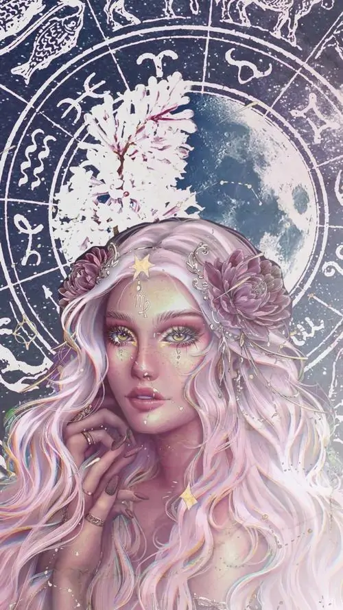Thiếu nữ tóc trắng tím lơ lửng dưới vòng tròn cung hoàng đạo, tay ôm bó hoa nhạt màu và lớp váy mỏng phủ khắp thân người, nhìn như hình đại diện Xử Nữ phong cách Nhật rất mơ