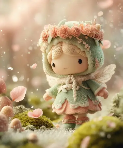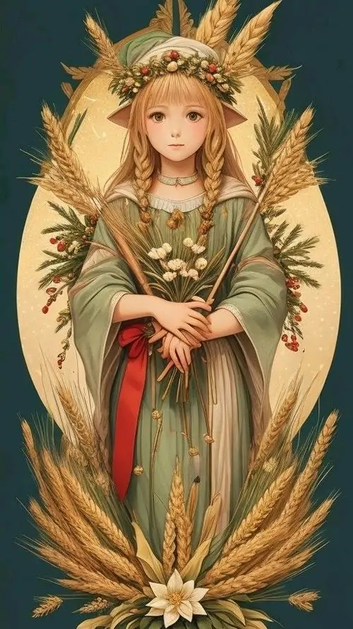Ảnh minh họa nhân vật nữ tóc vàng đội vương miện lá đứng chính diện, hai tay giữ bó lúa trước váy xanh rêu, bố cục dọc làm hình chibi cung đất nữ tính nghiêng sang cổ tích đẹp mắt