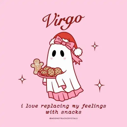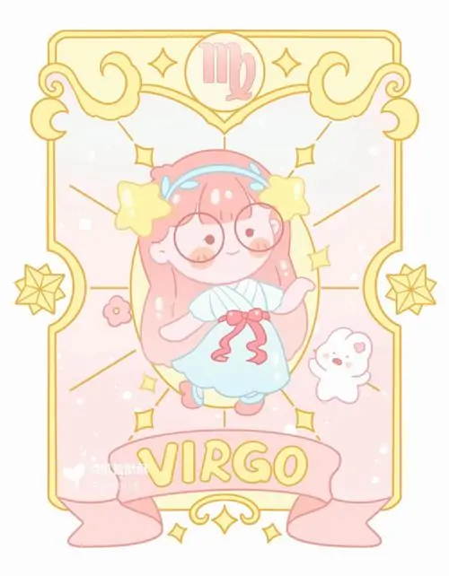 Ảnh pastel bé chibi tóc hồng ôm ký hiệu Virgo trước ngực, nét vẽ mảnh trên nền trắng hồng và chữ viết tay lớn phía trên làm bức này nhẹ tênh, dễ thương theo kiểu doodle