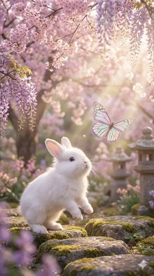 Chú thỏ trắng nhỏ đứng trên lối đá phủ rêu trong khu vườn ngập sắc hồng, ánh sáng cuối ngày làm bộ lông sáng bừng, hợp làm hình nền loài tai dài