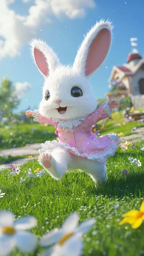 Chú thỏ trắng chạy tung tăng trên bãi cỏ đầy hoa dưới trời xanh, váy tím nhạt bay nhẹ theo bước chân làm khung hình như một ảnh nền thú cưng nhỏ vui mắt