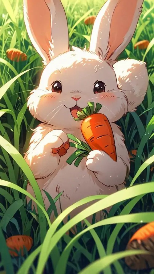 Hình nền dọc thỏ trắng mũm mĩm ôm củ cà rốt giữa bụi cỏ cao, đôi má hồng và biểu cảm rạng rỡ làm phông nền thỏ con này trông rất dễ thương