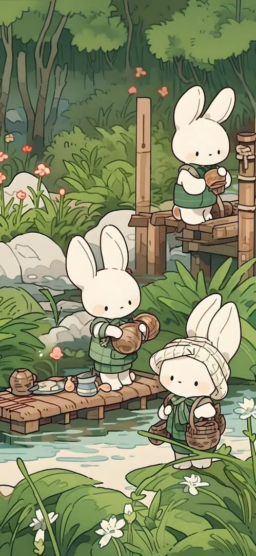Hình nền đàn thỏ trắng nhỏ quây quanh khu vườn gỗ xanh mát, một bé đứng cạnh chậu tưới cây nhìn rất ngoan, hợp làm hình nền con thỏ cho màn hình dọc dễ thương