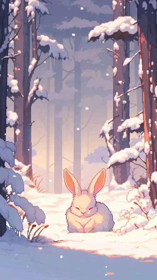 Chú thỏ nâu ngồi im trên nền tuyết giữa lối rừng phủ trắng, nắng lạnh hắt qua thân cây cao khiến ảnh nền thỏ mang vẻ yên tĩnh và sạch khung hình
