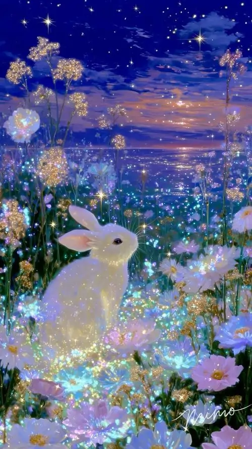 Ba chú thỏ trắng nép giữa thảm hoa tím dưới trời sao xanh biếc, ánh sáng lấp lánh phủ quanh thân tạo cảm giác mơ màng, kiểu ảnh nền thỏ rất hợp máy điện thoại
