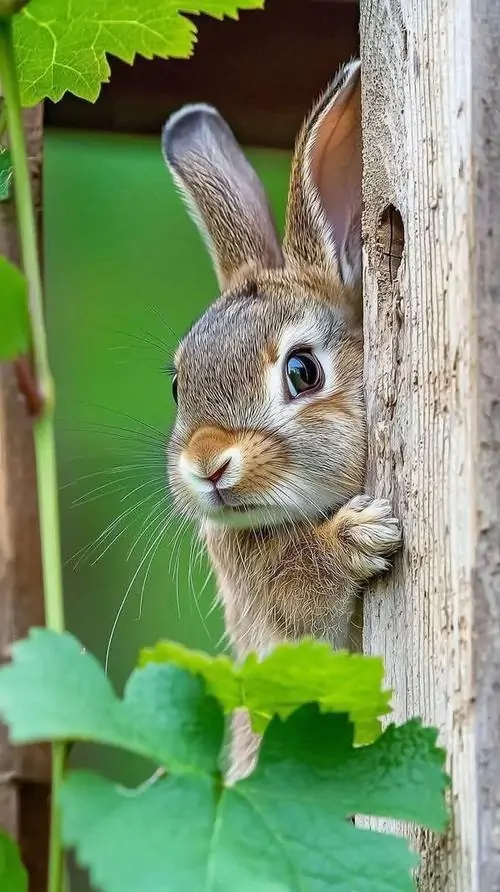 Một chú thỏ xám thò đầu sau thân cây, hai chân bám nhẹ vào vỏ gỗ và lá xanh ôm khung hình, góc nhìn gần làm ảnh nền động vật nhỏ trông sinh động hơn