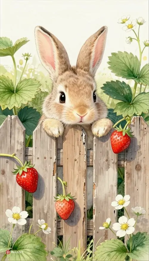 Một chú thỏ nâu nhô đầu qua hàng rào gỗ, quanh tai là lá xanh, dâu tây đỏ và hoa cúc trắng, bố cục xinh xắn khiến ảnh nền thỏ nhìn gần gũi hơn