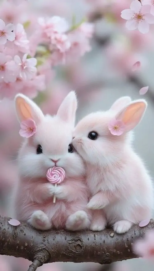 Hình nền Ultra HD hai chú thỏ áp mũi vào nhau giữa cành hoa hồng phấn, một bé trắng một bé nâu, góc chụp gần làm khoảnh khắc trông rất tình tứ