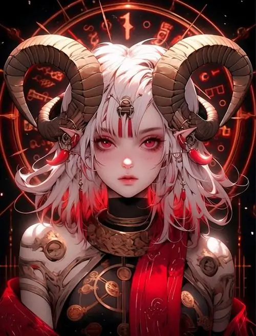 Nhân vật nữ sừng xoắn lớn đứng chính diện trong trang phục đỏ đen, môi nhỏ và ánh mắt gắt tạo cảm giác dữ hơn, hợp người thích ảnh Bạch Dương anime nữ ngầu