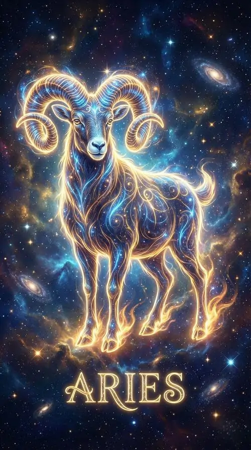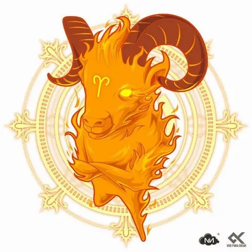 Hình vẽ Aries gương mặt cừu hiện lên từ khối lửa đỏ rực, hai mắt sáng và sừng cuộn lớn làm bố cục dọc rất gắt, hợp ai thích ảnh cung lửa đậm nhiệt