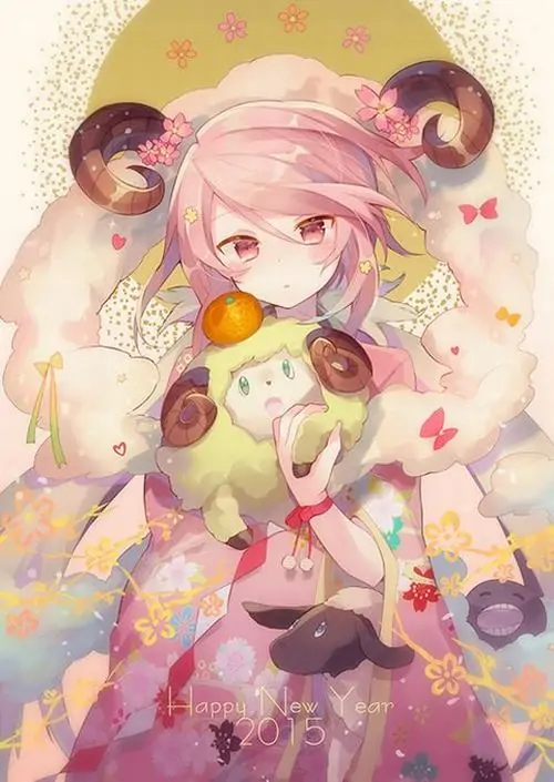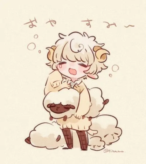 Nhân vật chibi má hồng mặc đồ vàng nâu đứng cạnh bé cừu nhỏ, hai tay mở ra và đôi mắt to làm bức này đáng yêu theo kiểu ảnh cung lửa cho nữ