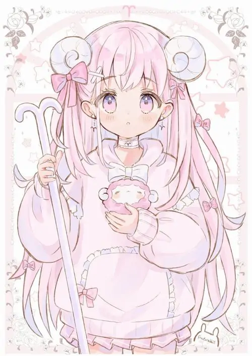 Ảnh hoạt hình bé gái tóc hồng ngồi ôm gối giữa nền pastel nhiều họa tiết mềm, cặp sừng nhỏ và váy rộng khiến ảnh Bạch Dương nữ này nhìn rất cute