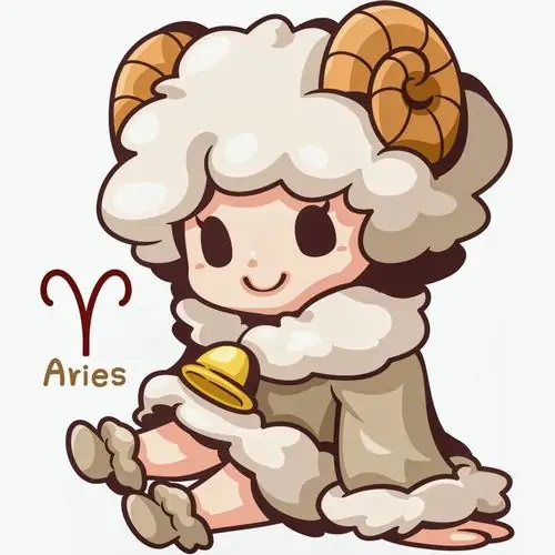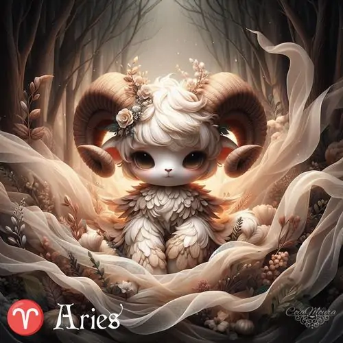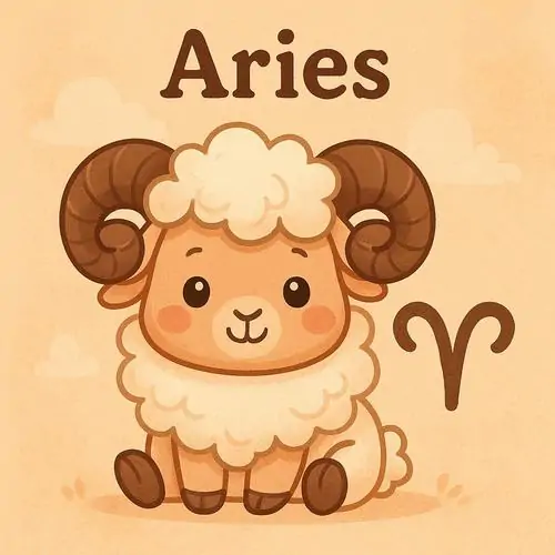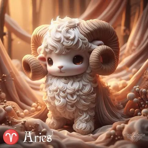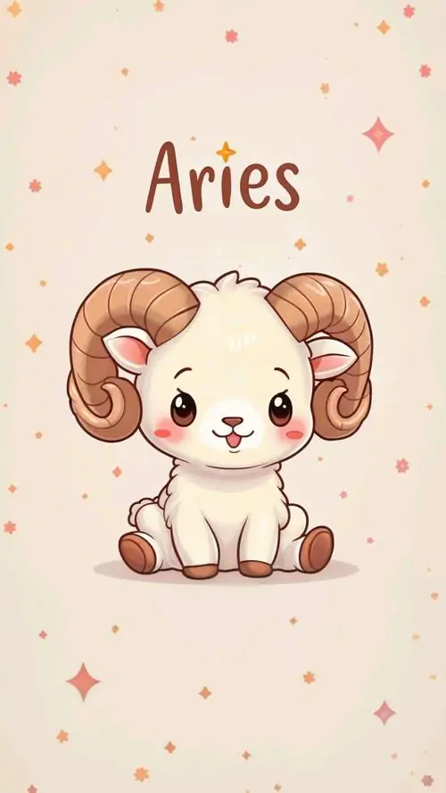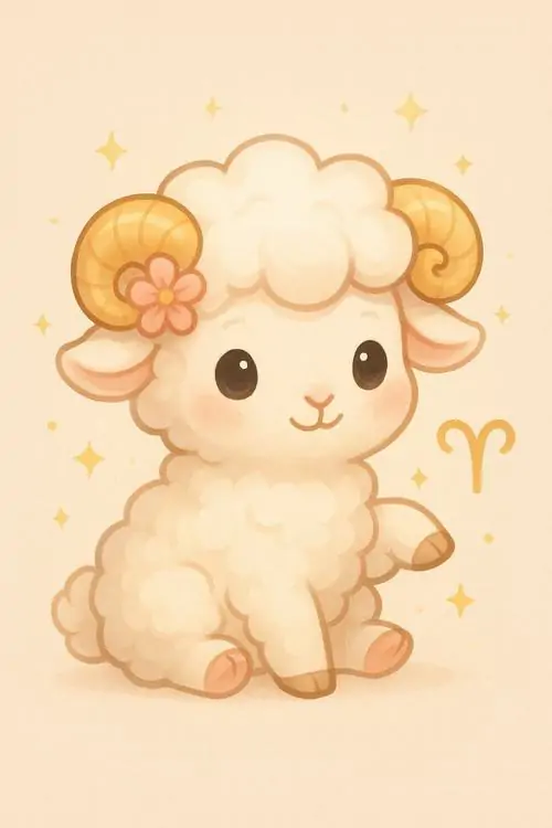 Hình vẽ Aries búp bê nhỏ mặc đồ lông màu kem đứng trên nền hồng nhạt, hai sừng nâu và khuôn mặt tròn làm cả bức trông mềm như đồ chơi dễ thương
