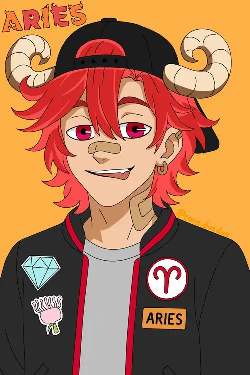 Cậu trai tóc đỏ đội mũ ngược, áo in chữ Aries và nền cam hồng phía sau khiến bức ảnh vui mắt, trẻ và đúng kiểu avatar hoạt hình cho nam Bạch Dương