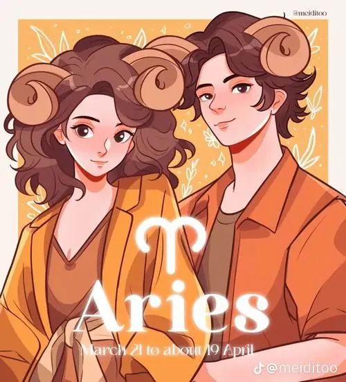 Cặp đôi hoạt hình mặc áo cam đứng sát nhau trước nền nhạt, cô gái cười mềm còn chàng trai nhìn nghiêng bình thản, tạo cảm giác ấm và hợp ảnh chủ đề Aries đôi