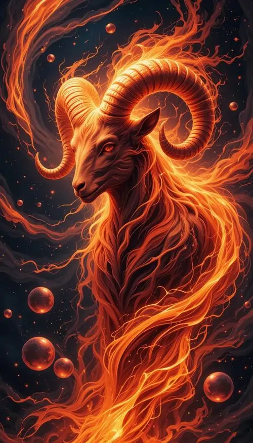 Con cừu lửa rực cam đỏ vươn cổ giữa nền đen, thân hình như được vẽ từ ngọn cháy đang cuộn lên, hợp với ai thích ảnh cung lửa mạnh và ngầu