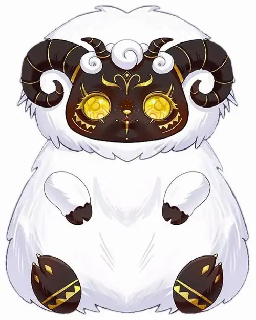 Con cừu hoạt hình thân tròn ngồi chính diện, sừng đen bóng và đôi mắt vàng lớn khiến bức này vui mắt, hơi ngầu nhưng vẫn giữ nét chibi rất rõ