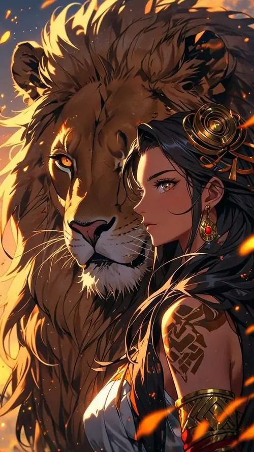 Góc bán thân của cô gái da nâu đứng sát bờm sư tử vàng cháy, khuyên tai dài và áo tối làm ánh nhìn trở nên gắt hơn, đúng chất hình tượng Sư Tử nữ cách điệu đẹp mắt