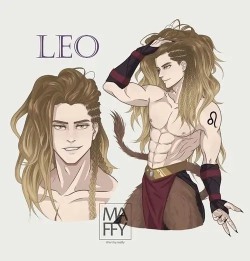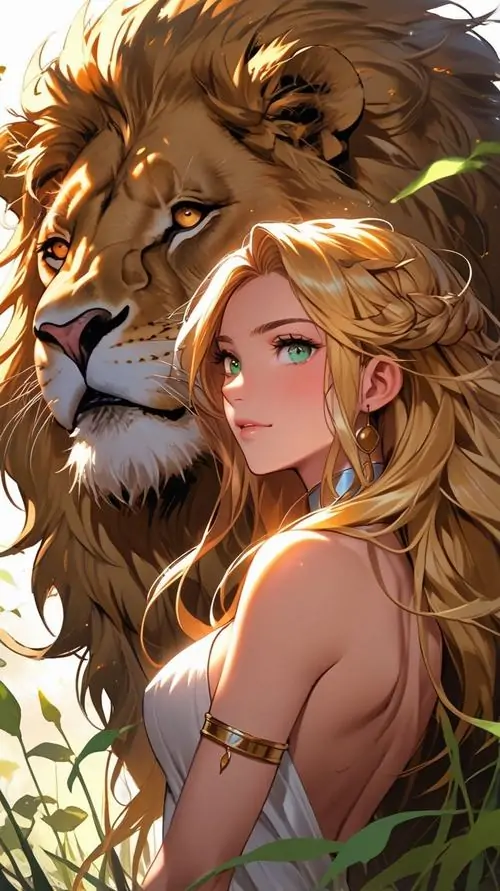 Thiếu nữ tóc vàng quay lưng nửa người, vai trần và vòng lá xanh nổi trên nền đầu sư tử ấm màu, bố cục gần làm tranh vẽ cung hoàng đạo Sư Tử phong cách Nhật trông rất đẹp