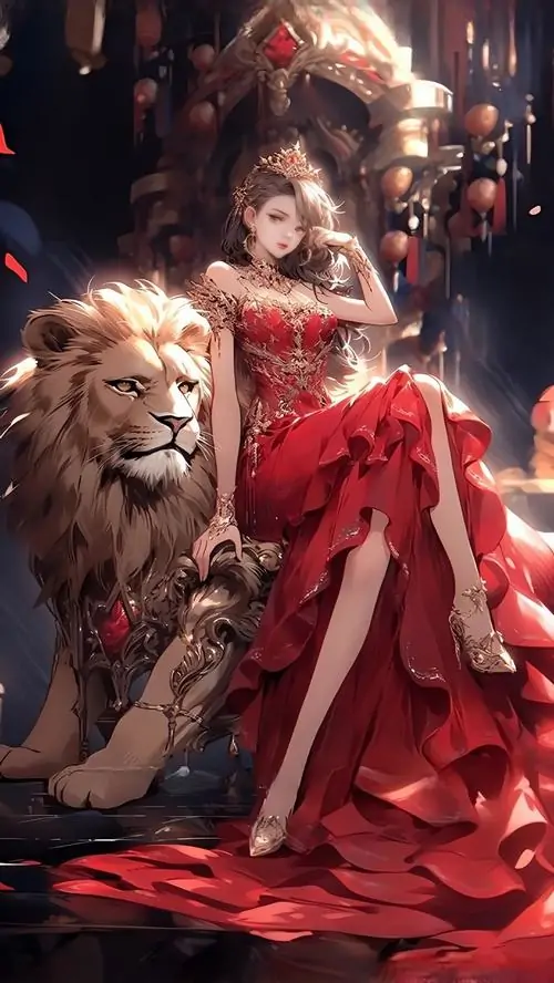 Nhân vật nữ ngồi trên ghế thấp cạnh sư tử, váy đỏ xẻ mềm và đèn ấm phía sau làm ánh mắt trầm lại, kiểu ảnh này hợp làm ảnh hồ sơ Sư Tử nữ sang mà dễ nhìn