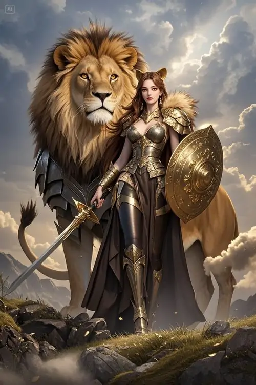 Một chiến binh cầm khiên đứng giữa đồng đá trước sư tử lớn, áo giáp bạc và góc nhìn thấp tạo cảm giác hùng tráng, dùng làm hình nền Leo rất ổn nếu thích nét cổ điển