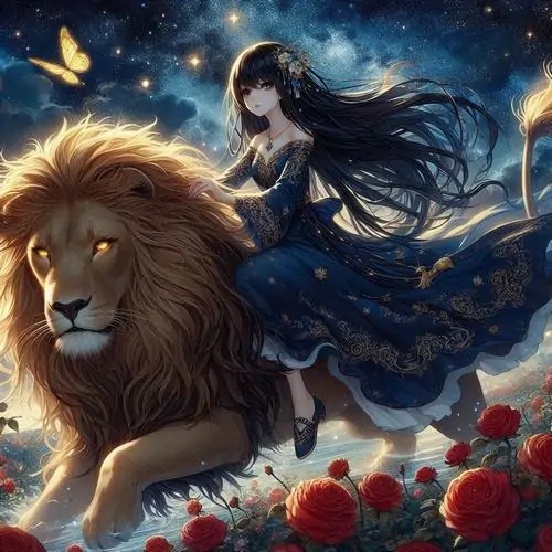 Ảnh nghệ thuật cô gái tóc đen váy xanh bay trên nền trời sao bên sư tử vàng, dải hoa đỏ phía trước làm khung cảnh mềm lại, hợp người mê hình vẽ Sư Tử nữ tí hon mộng mơ