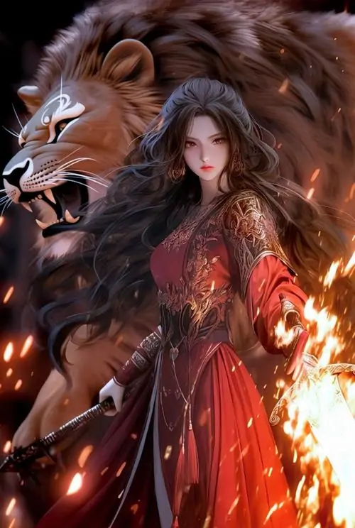 Thiếu nữ áo đỏ quay nửa người dưới đầu sư tử tối màu, lửa quấn quanh tay và mái tóc dài khiến bức này có độ nóng rõ, hợp ảnh nhân vật Sư Tử nữ cách điệu thiên hành động