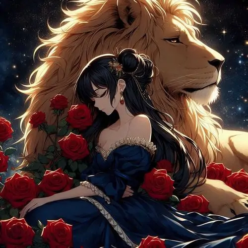 Thiếu nữ tóc đen váy xanh đêm ngồi bên sư tử sáng như nắng sớm, hoa hồng đỏ đặt quanh chân làm khung cảnh mềm và đẹp theo kiểu ảnh đại diện Sư Tử nữ dễ thương