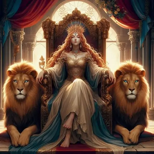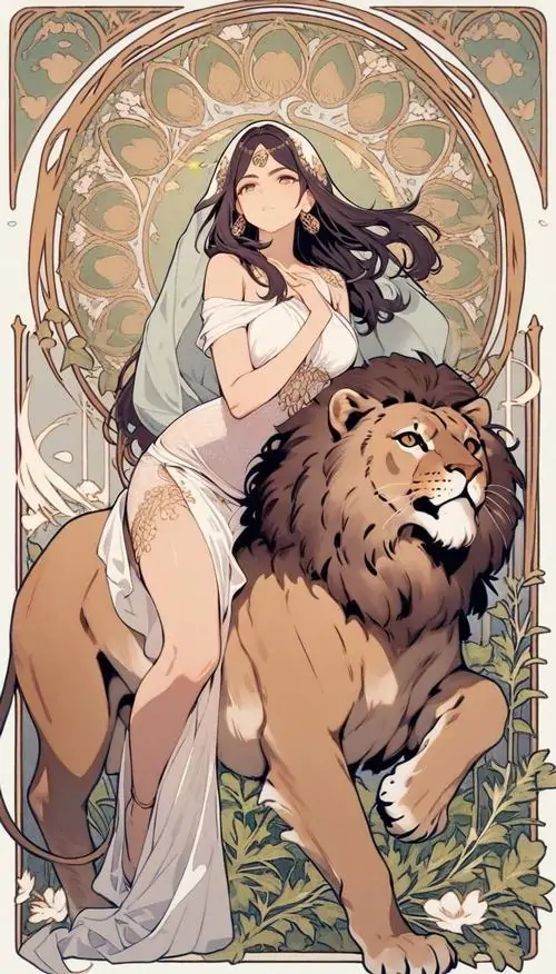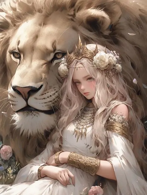 Cô gái ngồi bên sư tử trên nền tranh khung cổ điển, tóc dài buông nhẹ và váy ôm màu kem làm tổng thể dịu hơn, hợp người thích tranh vẽ cung hoàng đạo Sư Tử phong cách Nhật