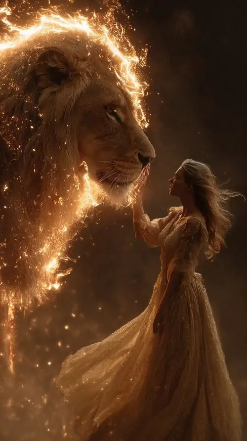 Bóng dáng nữ mặc váy dài đứng đối diện sư tử bằng ánh lửa trong nền nâu vàng, cả khung tối và thoáng làm tranh trông lặng hơn, hợp người thích hình nền hoàng đạo tối giản