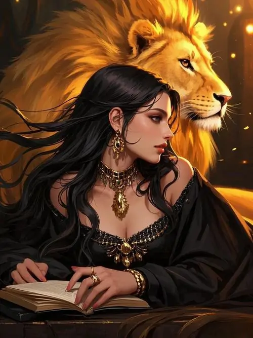 Ảnh chủ đề cô gái váy đen ngồi nghiêng trước đầu sư tử vàng lớn, mái tóc dài ôm vai và nền sao ấm giúp bức này vừa ngầu vừa hợp tinh thần tranh vẽ hoàng đạo Leo