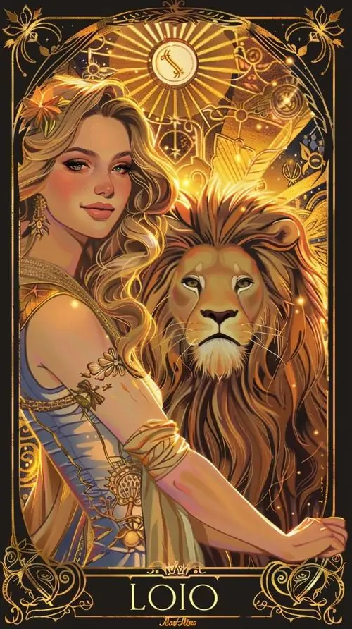 Ảnh đại diện người đẹp tóc vàng áp má vào bờm sư tử, ánh kim phủ dọc thân váy và nền tarot khiến khung hình sang hẳn, hợp một hình mẫu Sư Tử nữ nhỏ bé cá tính khá đẹp