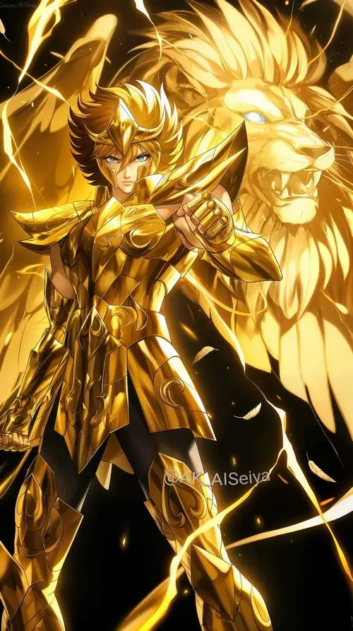 Chiến binh áo giáp vàng giang tay giữa luồng sét, mái tóc tung mạnh và dáng đứng chắc gọn khiến bức này thiên về chất anh hùng, hợp ai thích hình vẽ Sư Tử nữ tí hon pha action