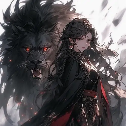 Hình đại diện anime cô gái tóc đen ngồi tựa cằm trước đầu sư tử vàng rực, váy đen cổ rộng và khuyên lớn khiến tổng thể sang, rất hợp ảnh Sư Tử nữ phong cách Manga