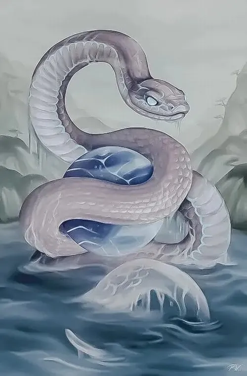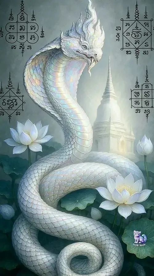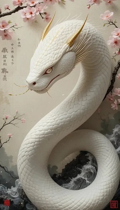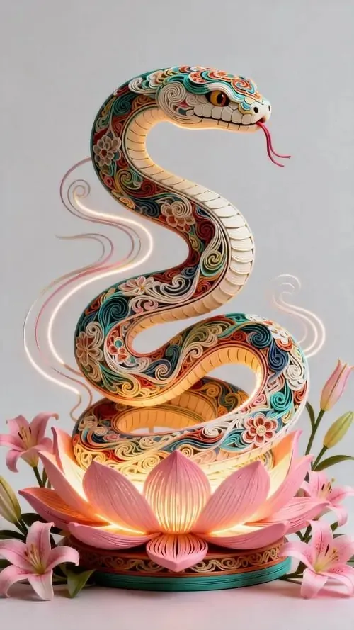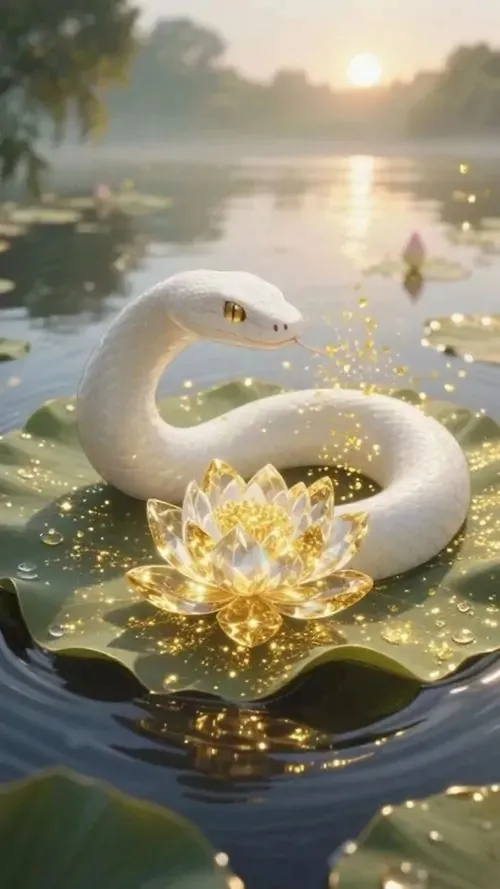 Rắn bạc thân dài nổi trên mặt hồ đen như gương, phía xa là chuông gió và cụm đèn lồng nhỏ, kiểu ảnh HD này đem lại cảm giác tĩnh mà vẫn có nhịp tài lộc khẽ mở