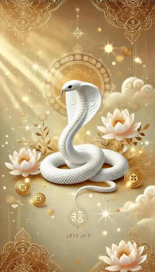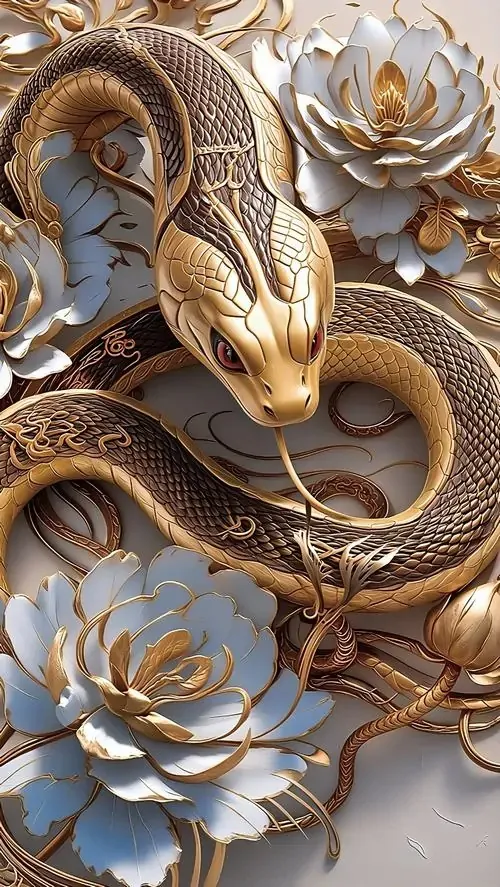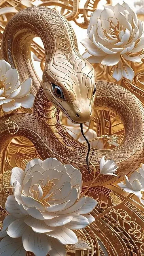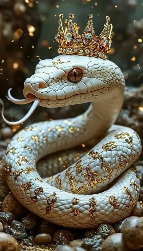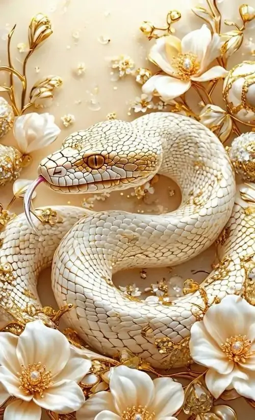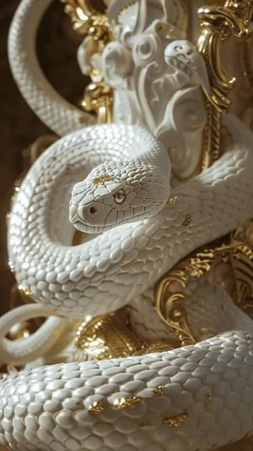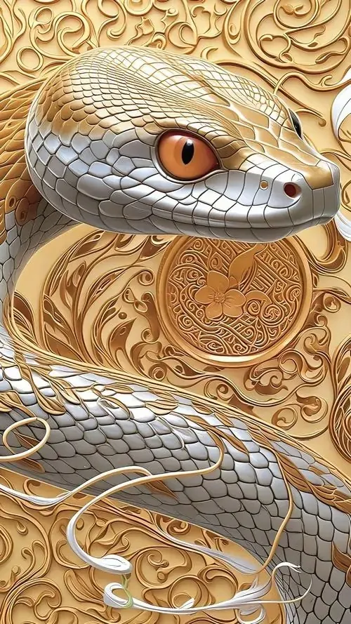 Ảnh wallpaper rắn trắng cuộn mình bên đồ trang trí dát vàng, nền tối làm thân rắn sáng bật lên, kiểu bố cục này hợp người tuổi Tỵ thích phong thủy tụ tài mà không quá rực