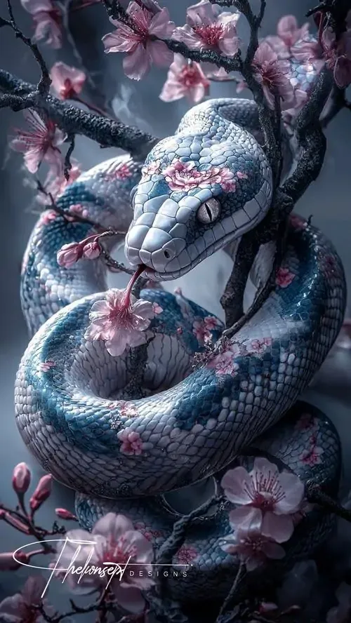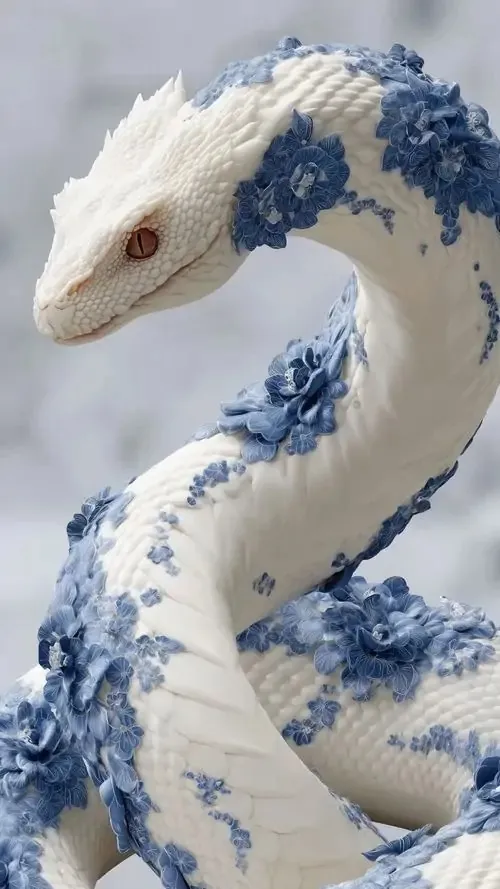 Ảnh nền rắn trắng xanh hiện lên giữa cụm hoa men lam, đầu cúi thấp và thân quấn chắc tạo cảm giác như đồ sứ cổ, rất hợp ảnh nền phong thủy mang nét thanh sạch