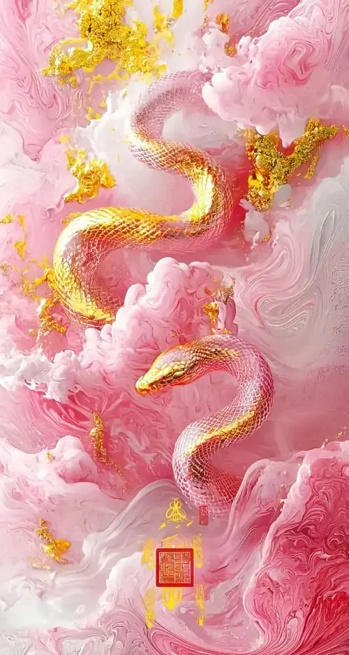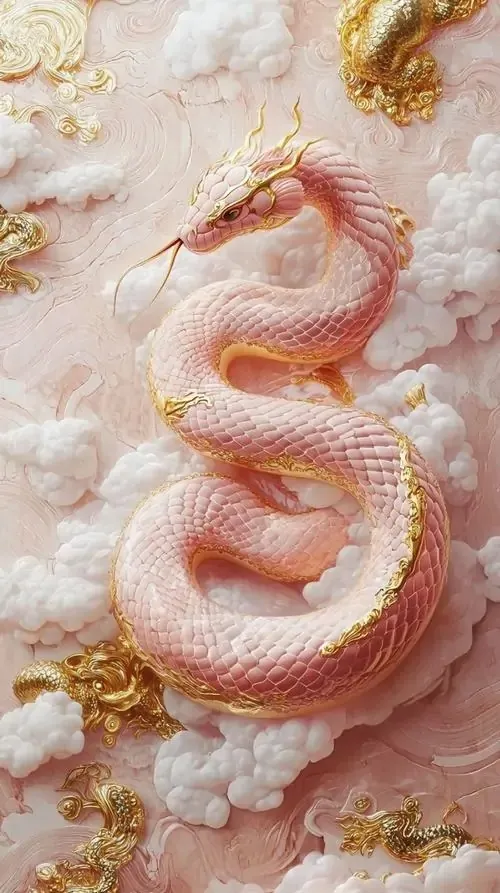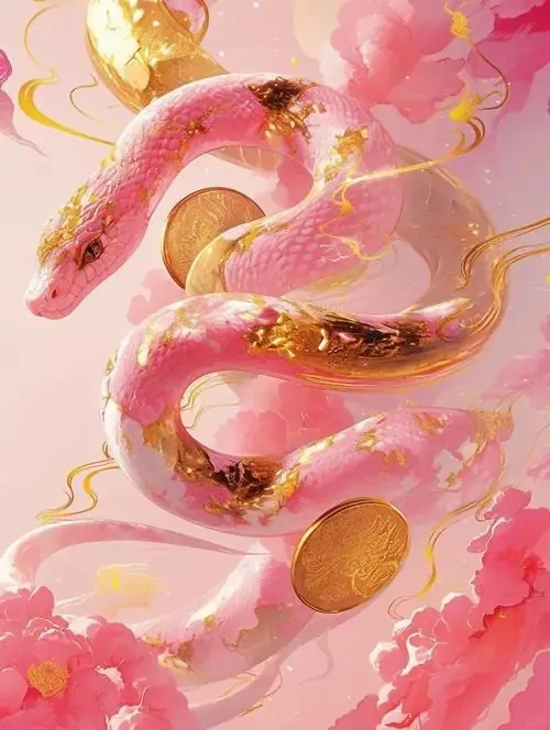Thân rắn hồng pha vàng lượn dài qua nền mây hoa và đồng xu, bố cục mềm như tranh trang trí đầu năm, hợp làm ảnh nền linh xà để nhắc chuyện chiêu tài và thu hút tiền bạc