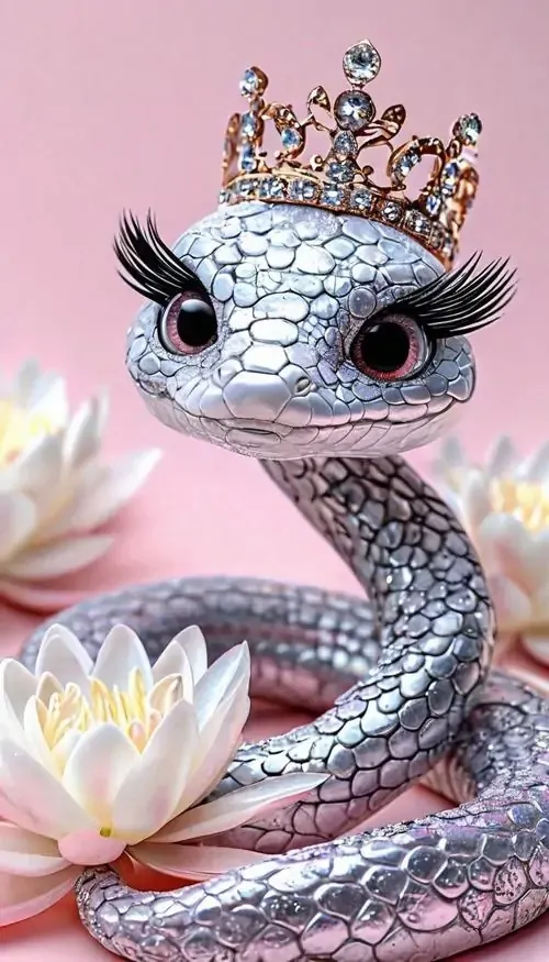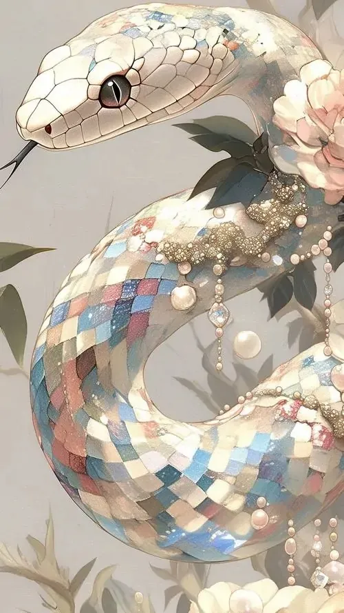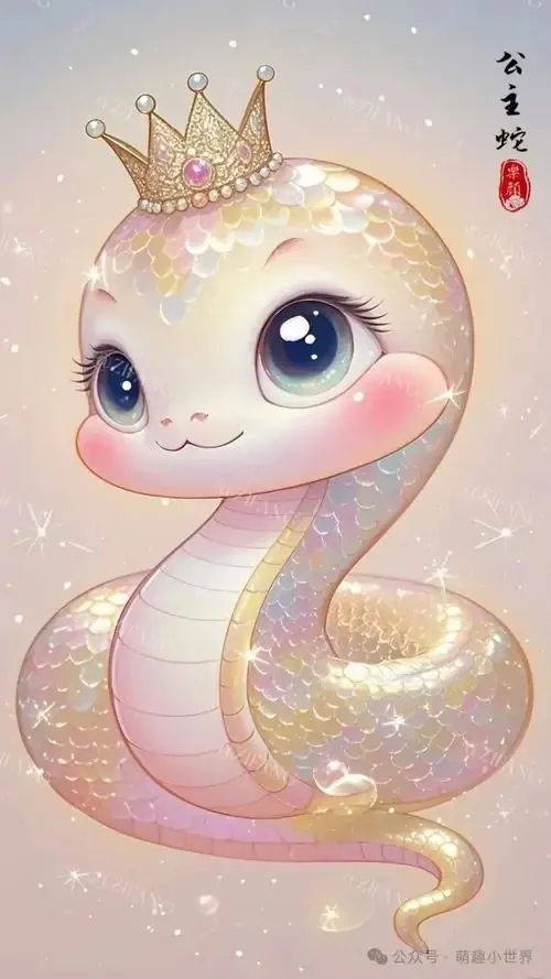 Rắn nhỏ màu ngọc trai đội vương miện vàng, mắt to sáng và thân phát ánh hồng pastel, kiểu minh họa Ultra HD này đem lại cảm giác may mắn, hợp làm wallpaper rắn tuổi Tỵ nữ tính