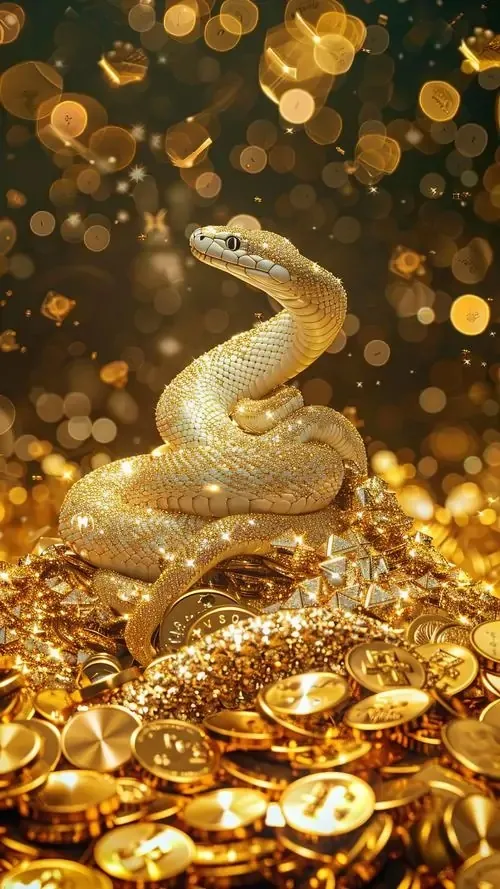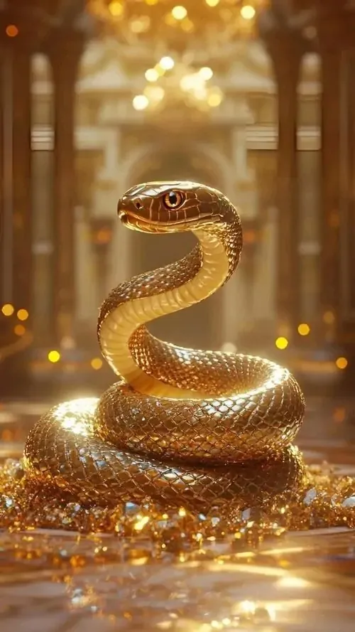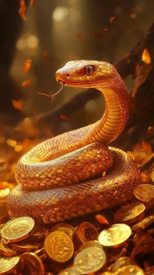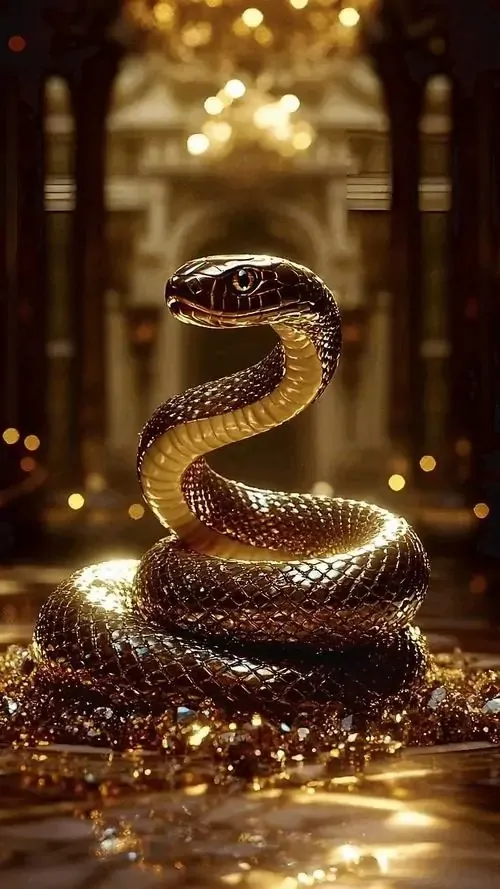 Rắn vàng óng cuộn tròn giữa sàn sáng lấp lánh như tiền xu, hậu cảnh là đèn vàng mờ sang trọng, kiểu ảnh đẹp này rất hợp làm wallpaper tuổi Tỵ gợi thu hút tiền bạc