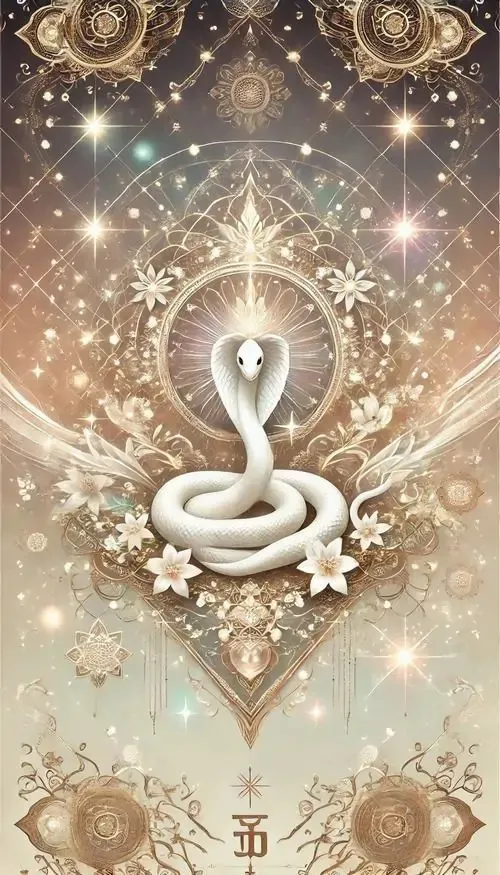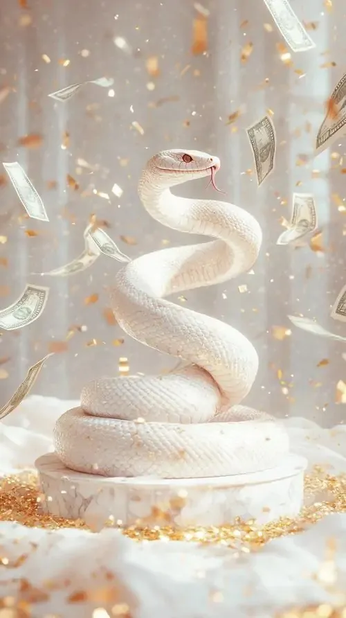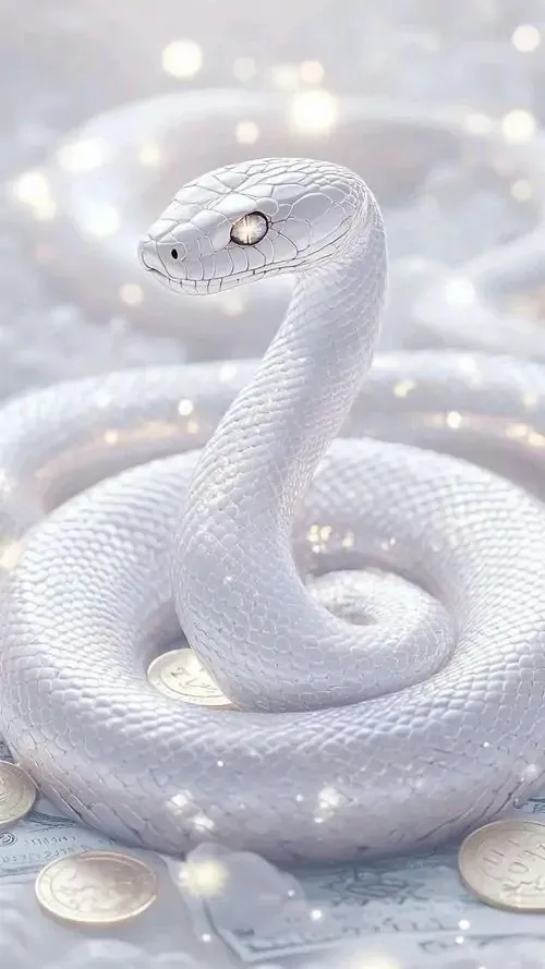 Rắn trắng cuộn xoắn như dải lụa giữa nền sáng phủ bụi vàng li ti, góc chụp chính diện khiến ảnh 4K trông sạch và sang, hợp làm hình nền phong thủy cầu thịnh vượng