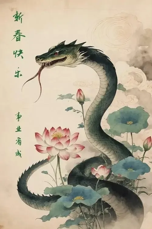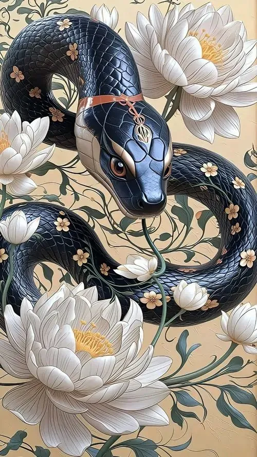 Hình nền điện thoại tranh thủy mặc vẽ rắn đen xanh vươn mình bên hoa sen, nét bút cổ điển và khoảng giấy trống đem lại cảm giác tĩnh, hợp người chuộng ảnh nền tuổi Tỵ thiên tâm linh