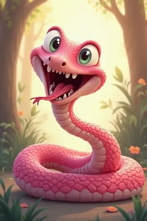 Ảnh nền rắn hồng há miệng cười lớn giữa nền rừng sáng ấm, thân cuộn thấp và mắt long lanh tạo cảm giác 3D sinh động, hợp kiểu hình nền tuổi Tỵ mang vận khí tươi mới
